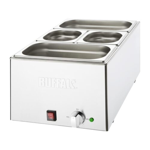 1,2 kW natte warmte. Inclusief 2x GN 1/3 & 2x GN 1/6 pannen Geheel RVS bain marie, ideaal voor een buffet of in de keuken. Voorzien van een regelbare thermostaat. Zowel met als zonder GN bakken verkrijgbaar.