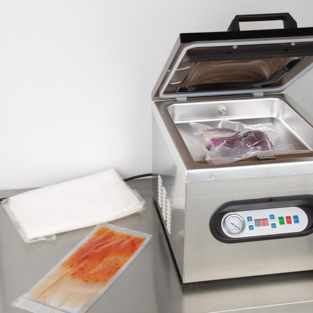 Duurzame constructie voorkomt lekken of besmetting. Luchtdichte afsluiting helpt voedsel tot 3-5 dagen langer vers te houden. Sluit de smaak in, ideaal om te marineren. Helpt uw koelkast of vriezer georganiseerd te houden. Ideaal voor het bereiden van voedsel voordat het eten begint, waardoor u tijd bespaart. Geschikt voor gebruik in een sous vide voor smaakversterkend koken. Geschikt voor gebruik met CN514 commerciële vacuümverpakkingsmachine. Maat: gladde zijde 75 micron. Maat: microgeulzijde 90 micron. . . .