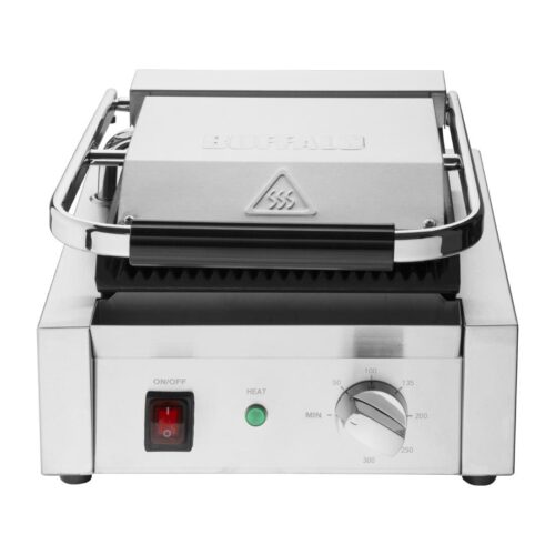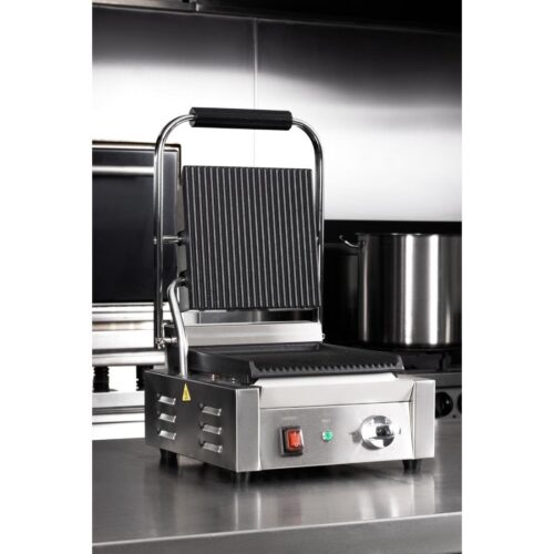 Vermogen: 1.5kW. Enkele grill. Geribbelde boven- en onderplaten