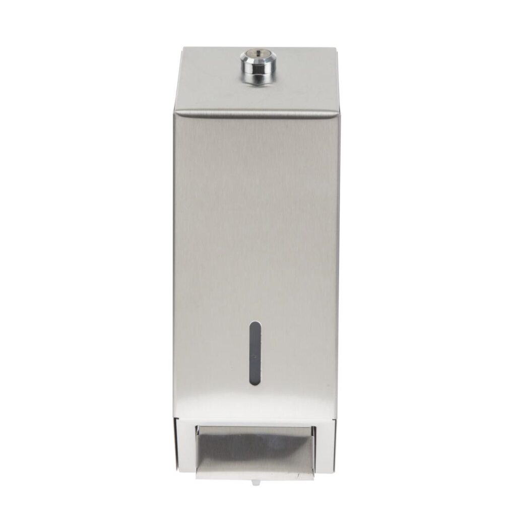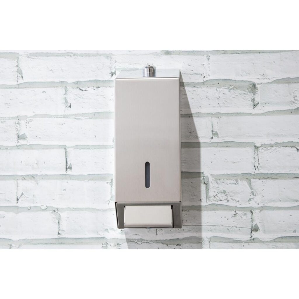 Capaciteit: 1 liter Stevige roestvrijstalen zeepdispenser met een stijlvol gepolijste buitenzijde. Ideaal als muurmodel in restaurants, ziekenhuizen en kantoren.