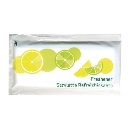 Groot formaat. 500 Stuks. Vochtig, met citroengeur, ideaal voor het reinigen van de handen na garnalen of spareribs. Doekjes: 15x13cm, handdoeken: 18,5x18,5cm.