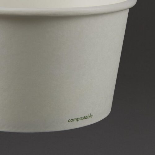 500 stuks Composteerbare bakjes met PLA coating voor onder meer soep en ijs. Platte of bolle deksels afzonderlijk verkrijgbaar.