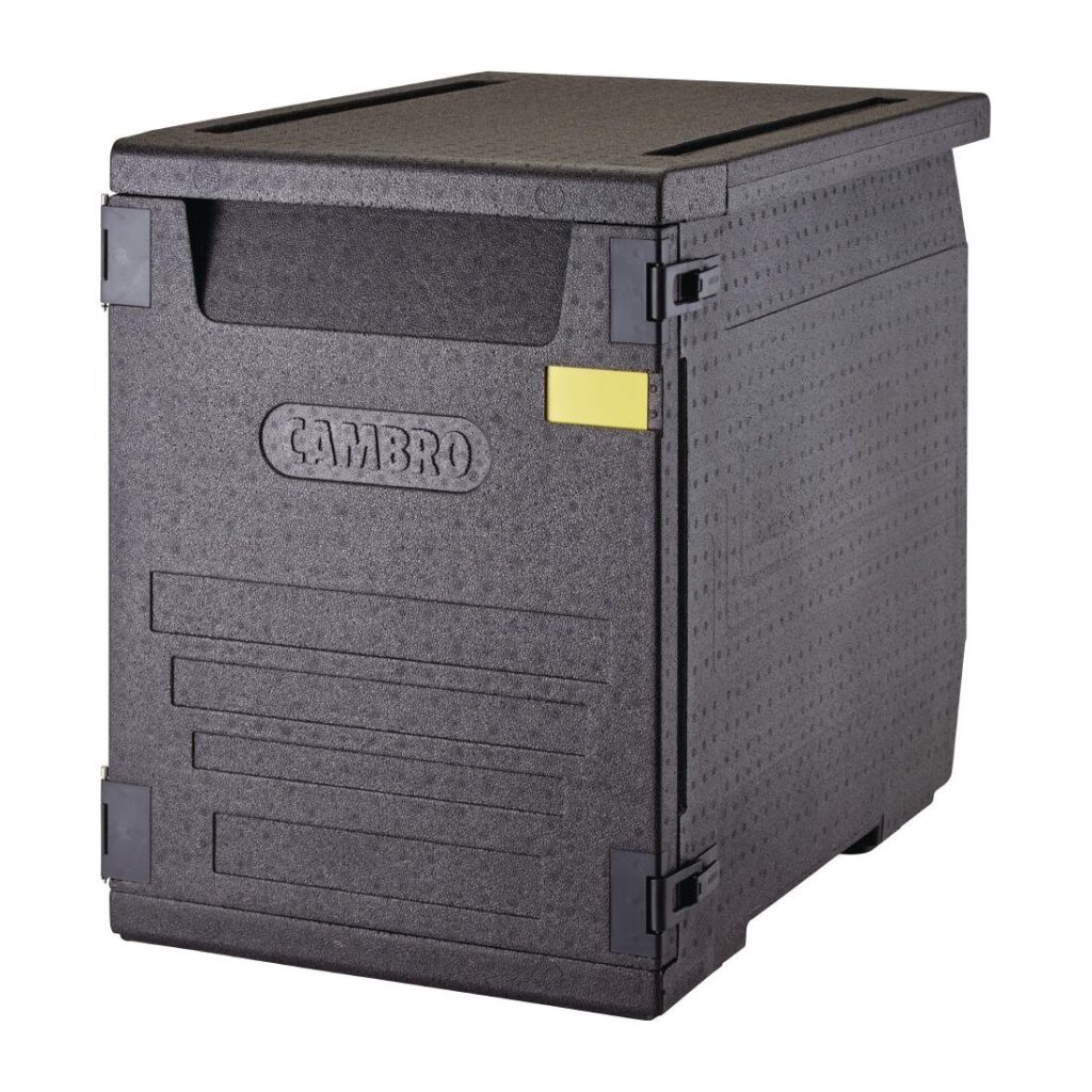 Voorlader. 60x40 kratten. Duurzaam schuim geïsoleerde voedselcontainer geschikt voor het vervoer van warme of koude gerechten. Voorlader voor eenvoudige toegang met een luchtdichte uitneembare pakking voor een veilige afdichting. Gebruik met onderstel voor eenvoudig transport.