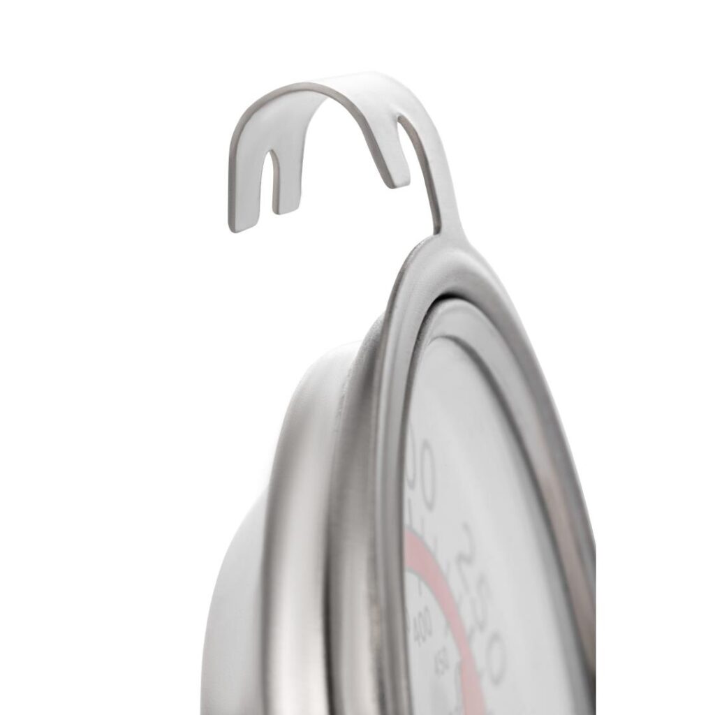 Bereik: +50°C tot +300°C. Met standaard en haak. Eenvoudig af te lezen Ø6,5cm wijzerplaat. Geschikt voor ovens en warmhoudkasten. 7x7,6cm. Temperatuurbereik 50°C tot +300° in 5°C stappen.