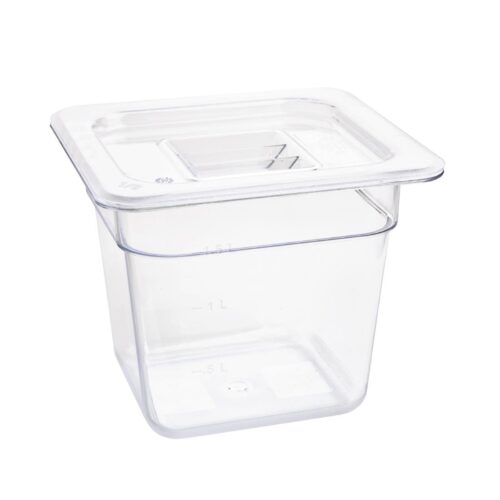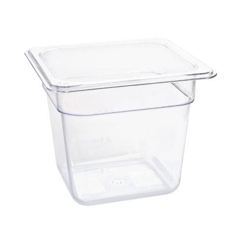 Capaciteit: 2,3Ltr. GN 1/6. Zesde maat. Diepte: 150mm 176x162mm.