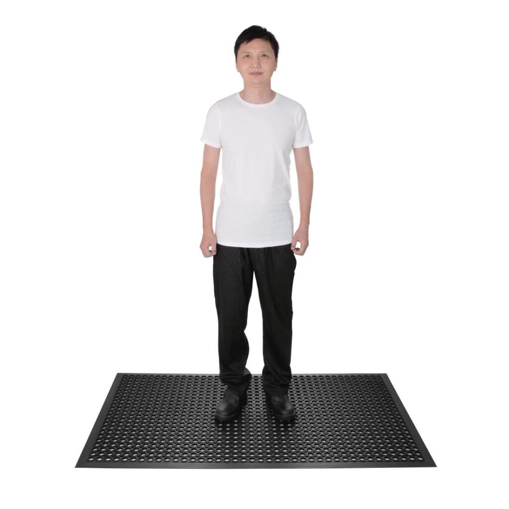 90x150cm. Zwart rubber. Kussenmat met afgeschuinde rand voor gebruik bij aanrechten, bargebieden, natte gebieden of gebieden waar personeel gedurende lange periodes staand werkt. Wasbaar. 150x90cm.