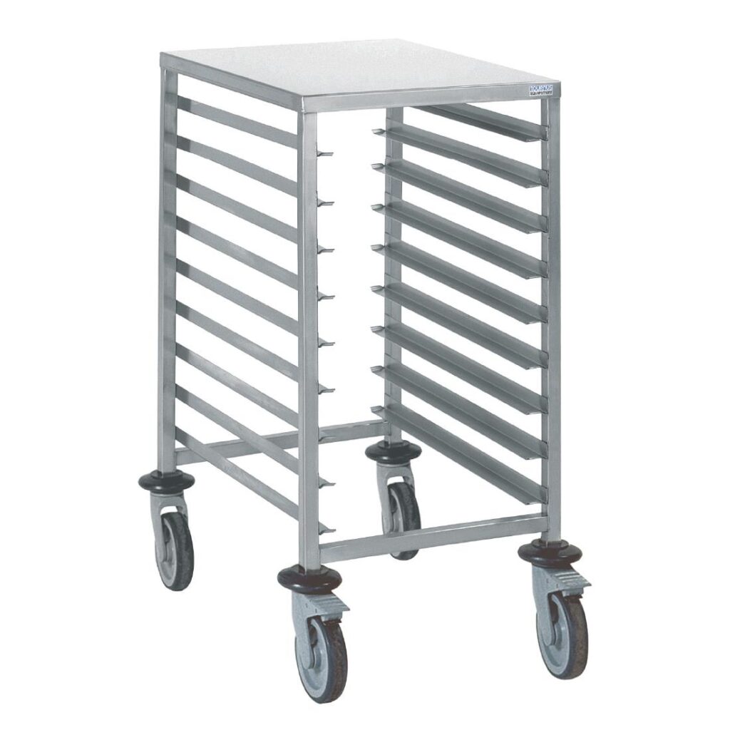 Materiaal: RVS. Afmeting: 90(h)x54(b)x72,5(d)cm. Capaciteit: 9 bladen/250kg. Voorzien van vier zwenkwielen voor het veilig en snel vervoeren van en naar de keuken.