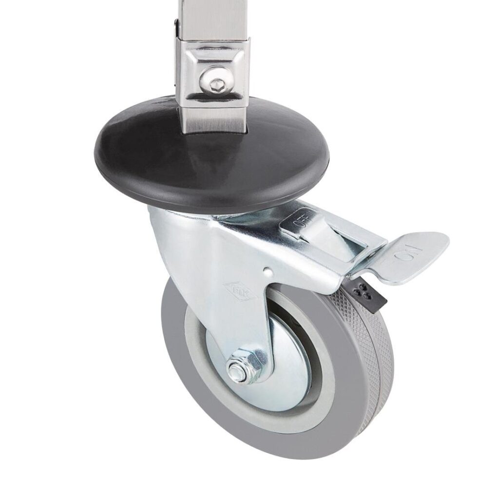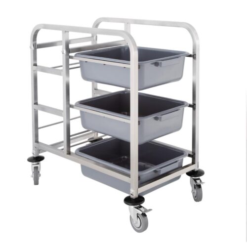 Materiaal: RVS. Afmeting: 90(h)x82(b)x44(d)cm. Een RVS afruimwagen, ideaal voor gebruik in hotels, scholen en ziekenhuizen. Bumpers aan alle 4 de wielen voor extra veiligheid en 2 wielen met remmen. Te gebruiken met J849 afruimbakken (3 inbegrepen).