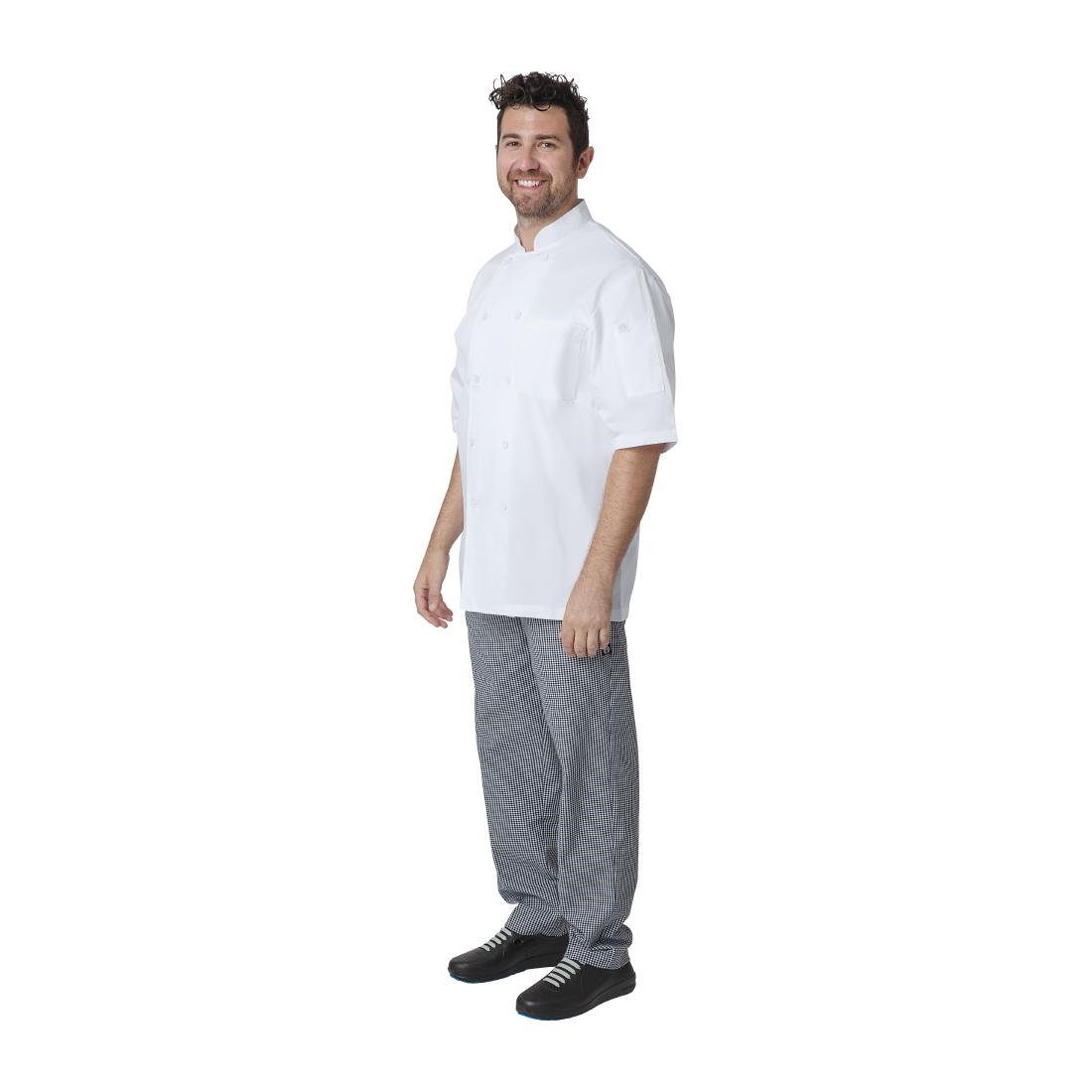 Stoffen knopen. Borstzak en mouwzakje links. Dubbele sluiting. Cool Vent pand op de rug. . . . . Korte mouw. . Erkend door Brits Gastronomisch Gilde. Klassieke pasvorm.