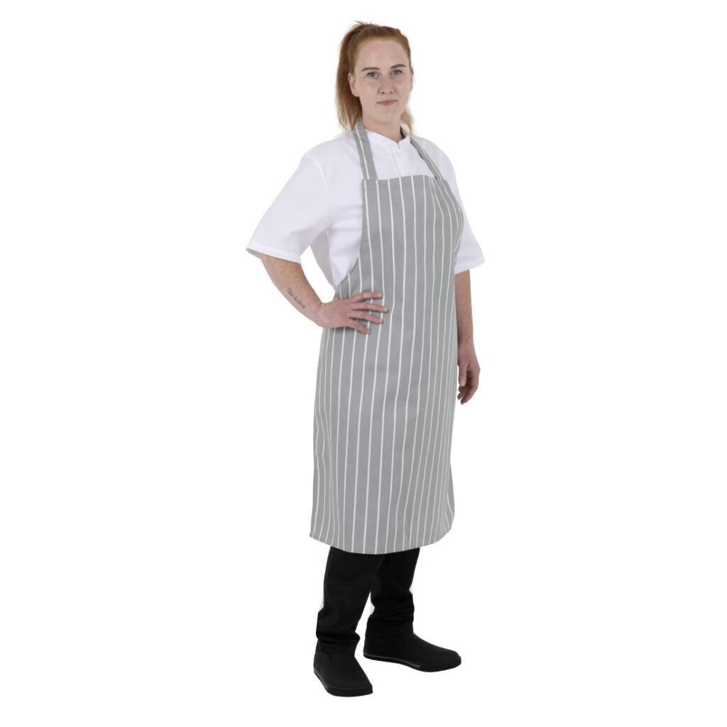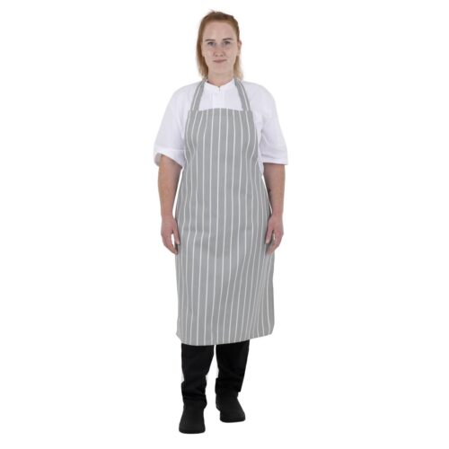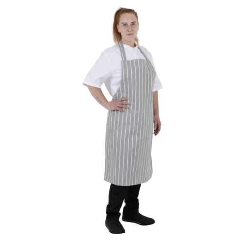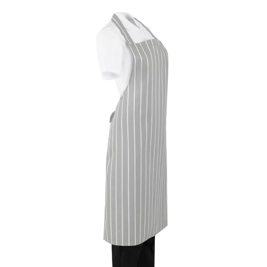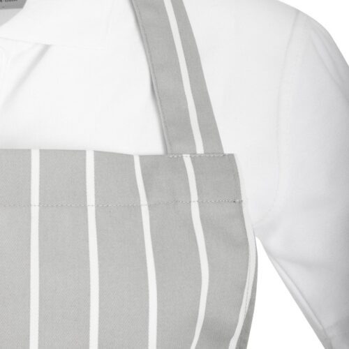 Maat: 950(L) x 700(B)mm | Polykatoen In een stijlvol grijs en wit ontwerp combineert de gestreepte slagersschort van Whites mode met functionaliteit, waardoor het perfect is voor professionele keukenomgevingen.Ontworpen voor duurzaamheid en gemak, heeft de schort een klassieke pasvorm die je comfortabel houdt tijdens lange diensten, terwijl de volledige bibvorm effectief je witten beschermt tegen spetters en vlekken - perfect om je een verzorgde uitstraling te laten behouden. Bovendien is het geschikt voor commerciële wasserij, wat zorgt voor snelle en gemakkelijke reiniging.