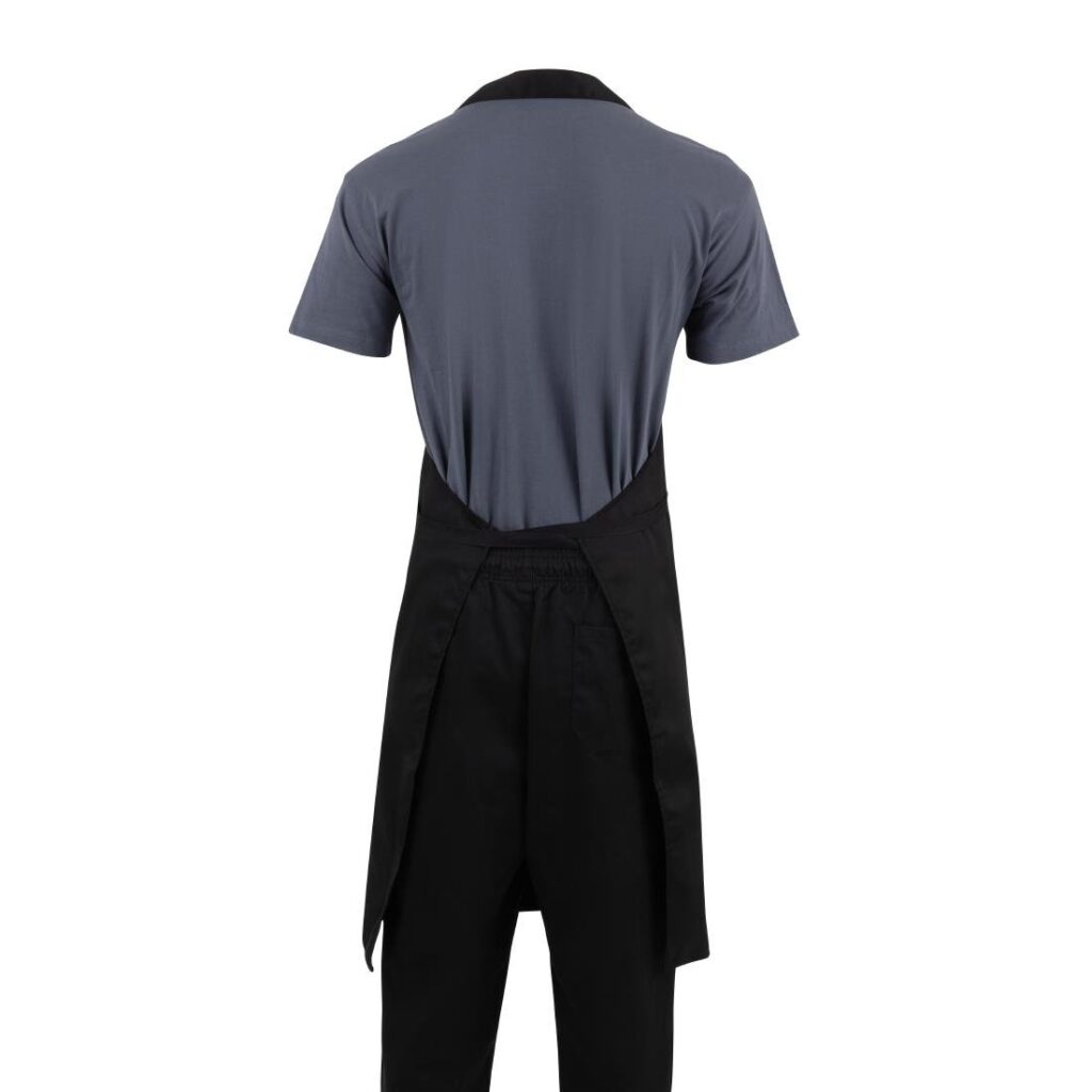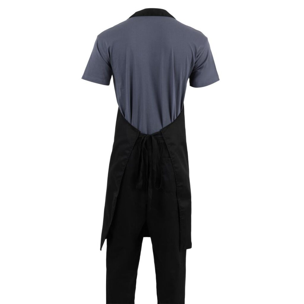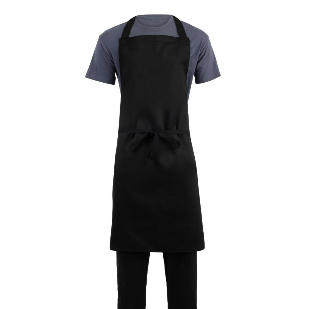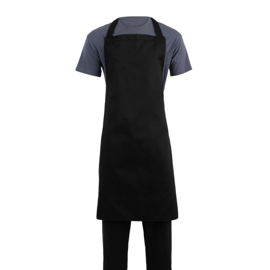 Zwart | Polykatoen | 90(B) x 104(L)cm Extra breed schort dat volledige bescherming biedt aan het lichaam. Gemaakt van slijtvast polyeter/katoen met ingestikte banden. Geschikt voor keuken en bediening. Afmeting: 104cm lengtex90cm breedte.