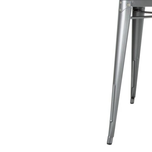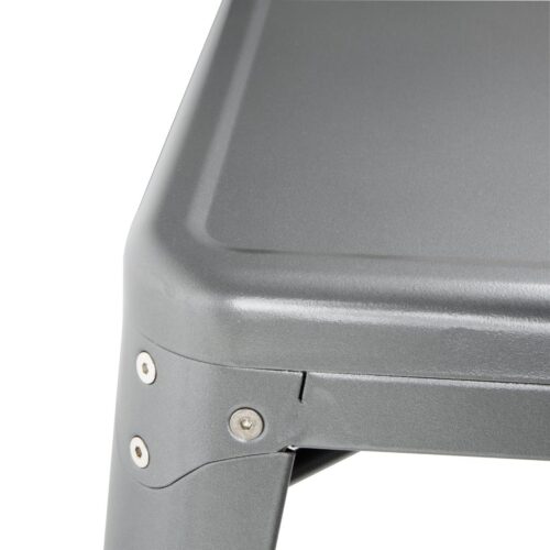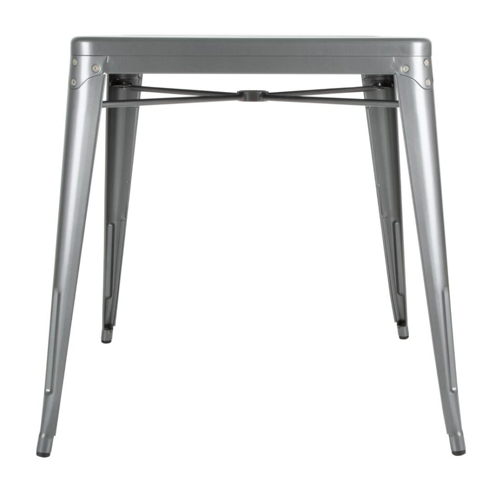 Stapelbaar frame en blad. 76(h)x66(b)x66(d)cm. Sterke tafels van gegalvaniseerd staal. Eenvoudig in schoonmaak en onderhoud, perfect voor drukbezochte horecaondernemingen.