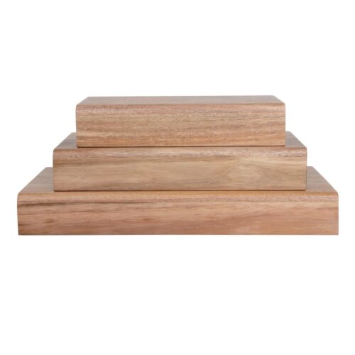 Set van 3 verhogers van verschillende grootte Acaciahouten verhogingsdisplays in verschillende maten voor een aanlokkelijke presentatie van bijvoorbeeld buffetschotels en sharing platters.