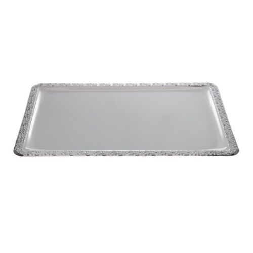 50x36cm. Materiaal: gepolijst RVS met bewerkte rand. RVS serveerschalen in verschillende maten.