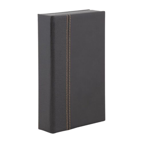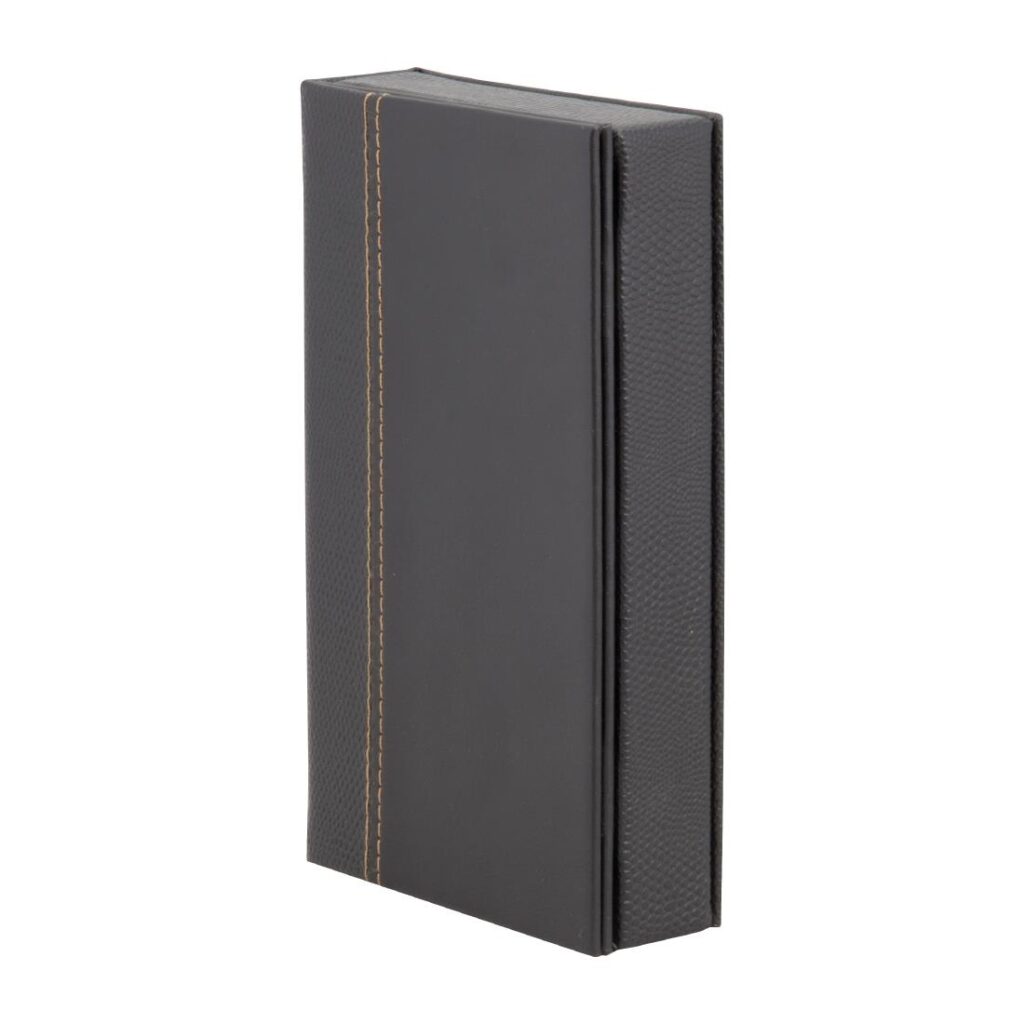Trendy rekeningpresentator in lederen stijl in zwart, doosstijl 183x125x23mm Slijtagebestendig ledereffect A4- of A5-menuhouders met standaard vier zijdisplays. Om menukaarten aan te vullen kunt u doorzichtige mappen met gouden koord aanschaffen (apart verkrijgbaar). Menukaarten niet inbegrepen.