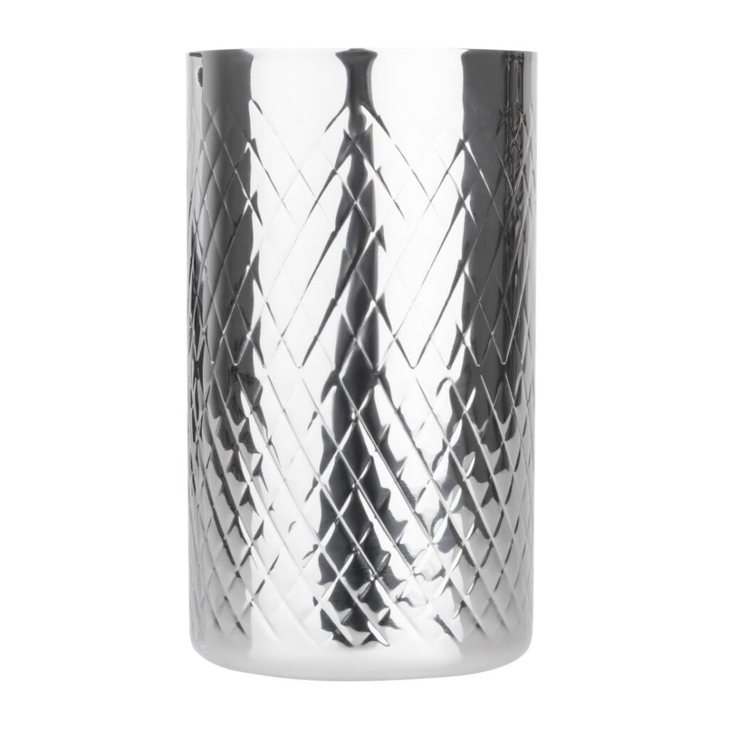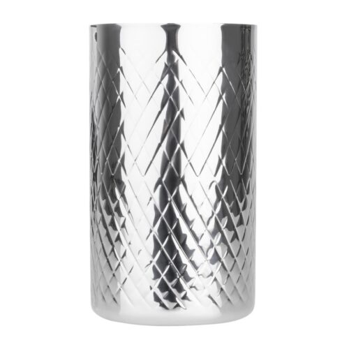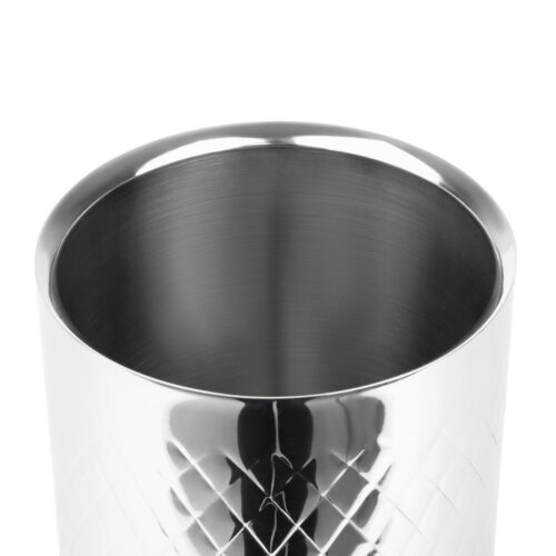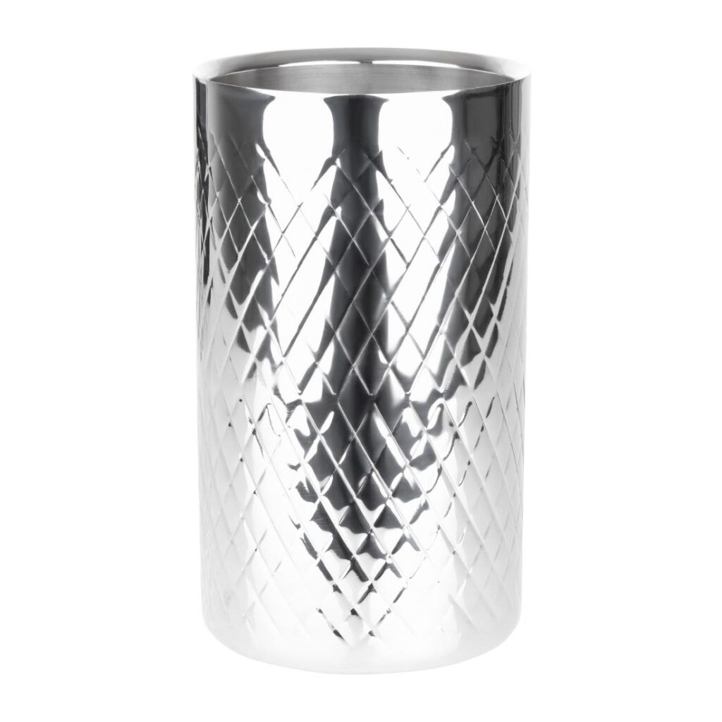 Olympia Geo Dubbelwandige Wijnkoeler Roestvrij Staal Zorg ervoor dat je flessen gekoeld blijven en klaar om te serveren zijn met deze dubbelwandige wijnkoeler van Olympia. Met een stijlvol gestructureerd oppervlak is de koeler gemaakt van duurzaam dubbelwandig roestvrij staal en houdt standaard champagne- en wijnflessen tot 750ml. Deze wijnkoeler is ook eenvoudig schoon te maken na gebruik, terwijl de stevige basis helpt om stoten en morsen te verminderen, voor extra stabiliteit.