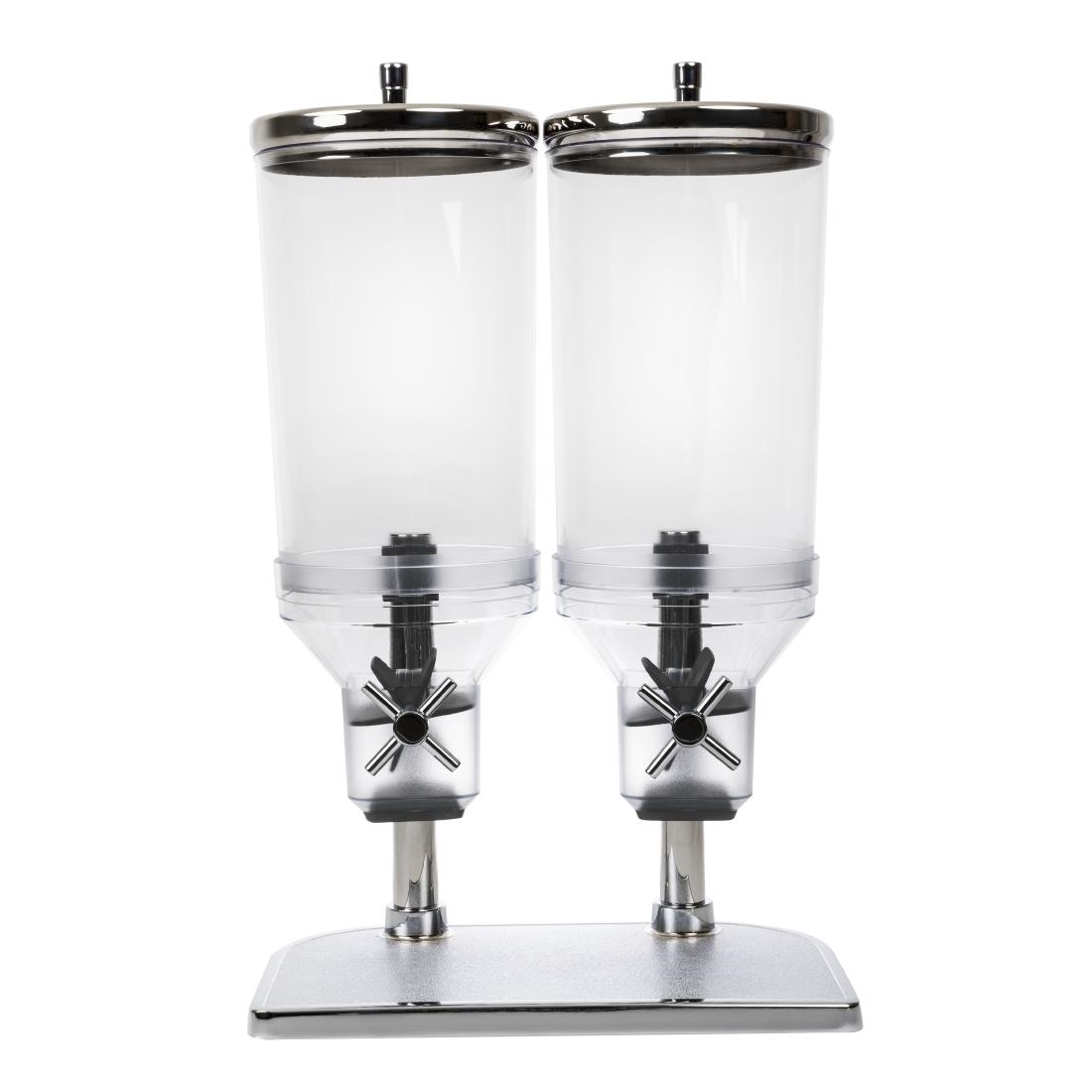 2x 4,5L. Kleur: transparant. Vaatwasserbestendige kunststof behuizing met 18/10 RVS deksel en verchroomde voet. Tikmechanisme voor afgemeten porties. Ideaal voor ontbijtbuffet en self-service.