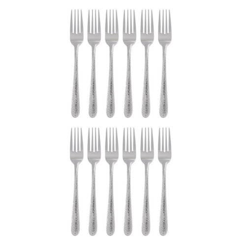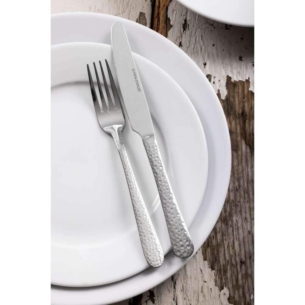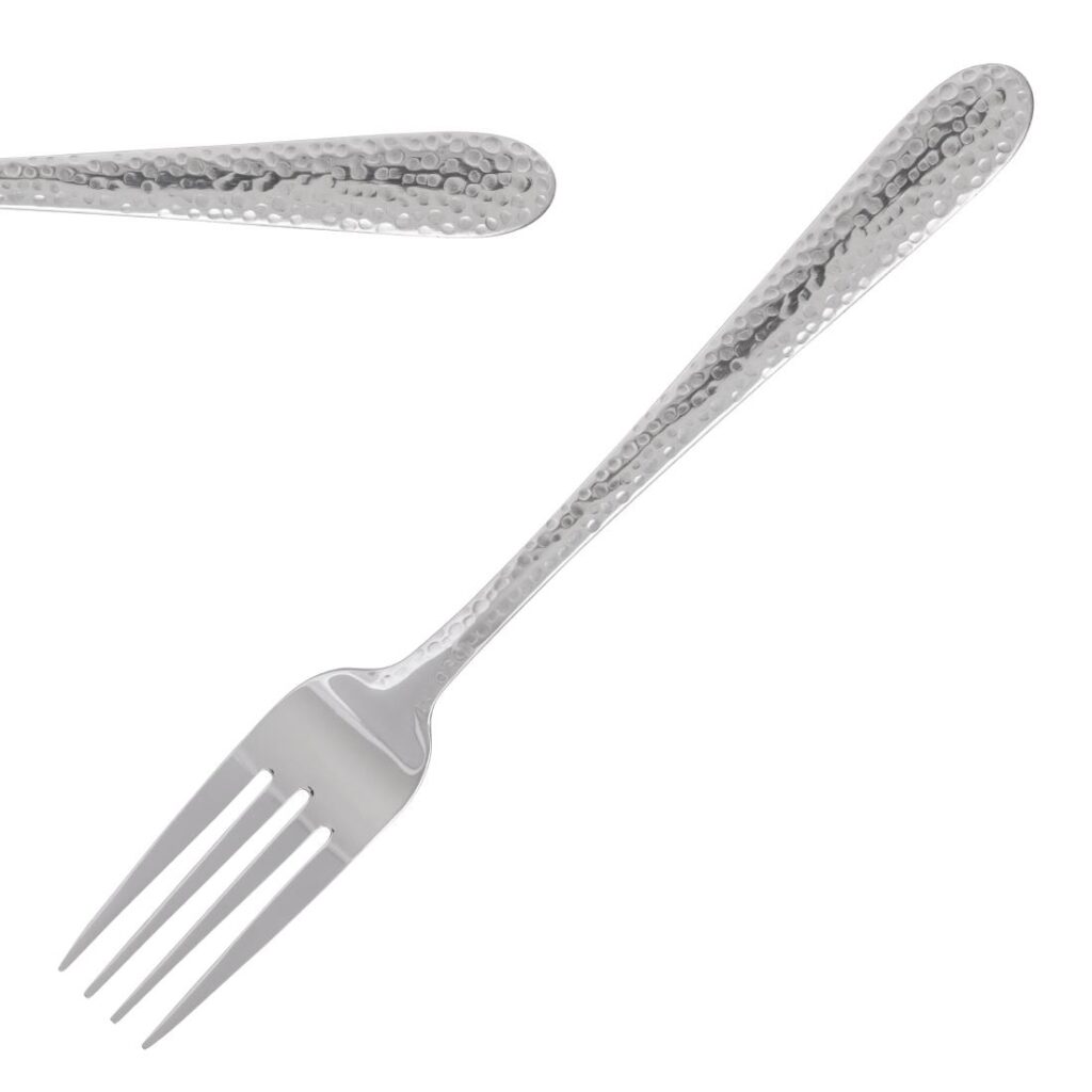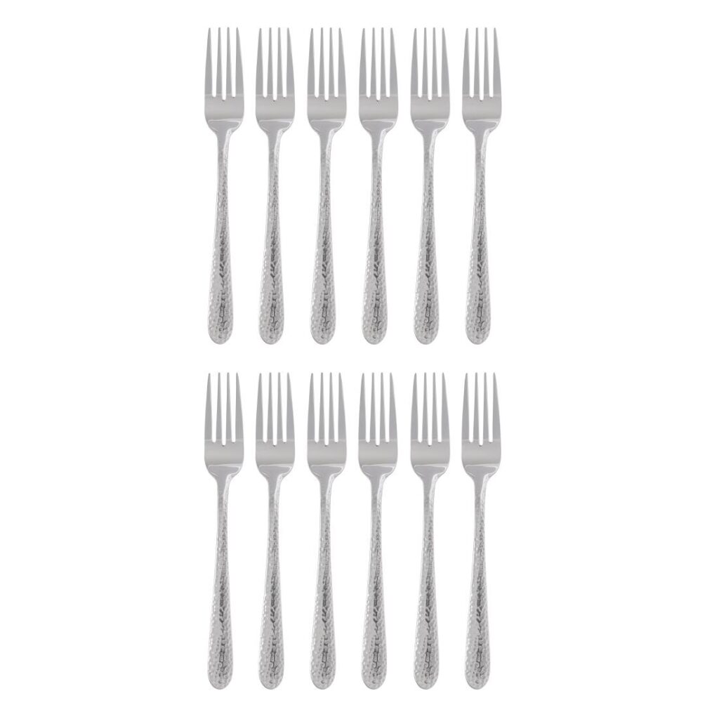 20(l)cm. 12 stuks. Materiaal: 18/10 RVS. Dit bestek heeft een uniek, gehamerd effect dat tafels een stijlvol accent geeft. Het is gemaakt van hoogwaardig 18/10 RVS met een hoogglans afwerking en heeft een traanvormig heft. Vaatwasserbestendig
