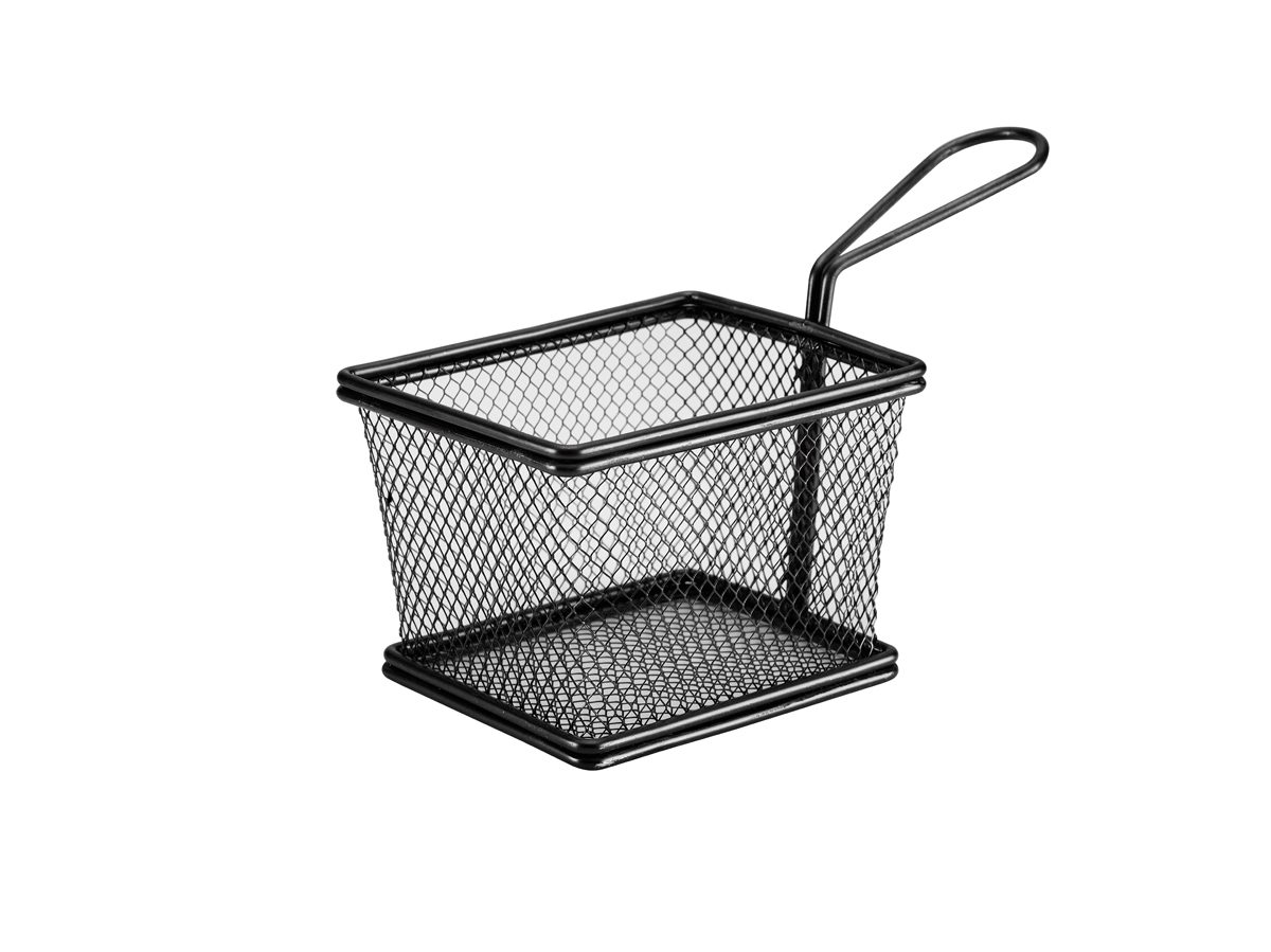 Pres. draadmandje zwart rechth. 12,5 x 9,7 x 8,5 cm: Rechthoekig zwart presentatiedraadmandje met afmetingen van 12,5 x 9,7 x 8,5 cm.